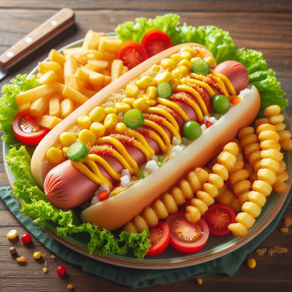 Pão de cachorro-quente, 1 salsicha, milho, ervilha, batata palha.